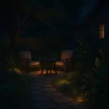 خدمات تركيب الإضاءة المبتكرة، مثل الإضاءة المخفية، الإضاءة الأرضية، وإضاءة الأشجار، لإبراز جمال الجلسة في المساء.